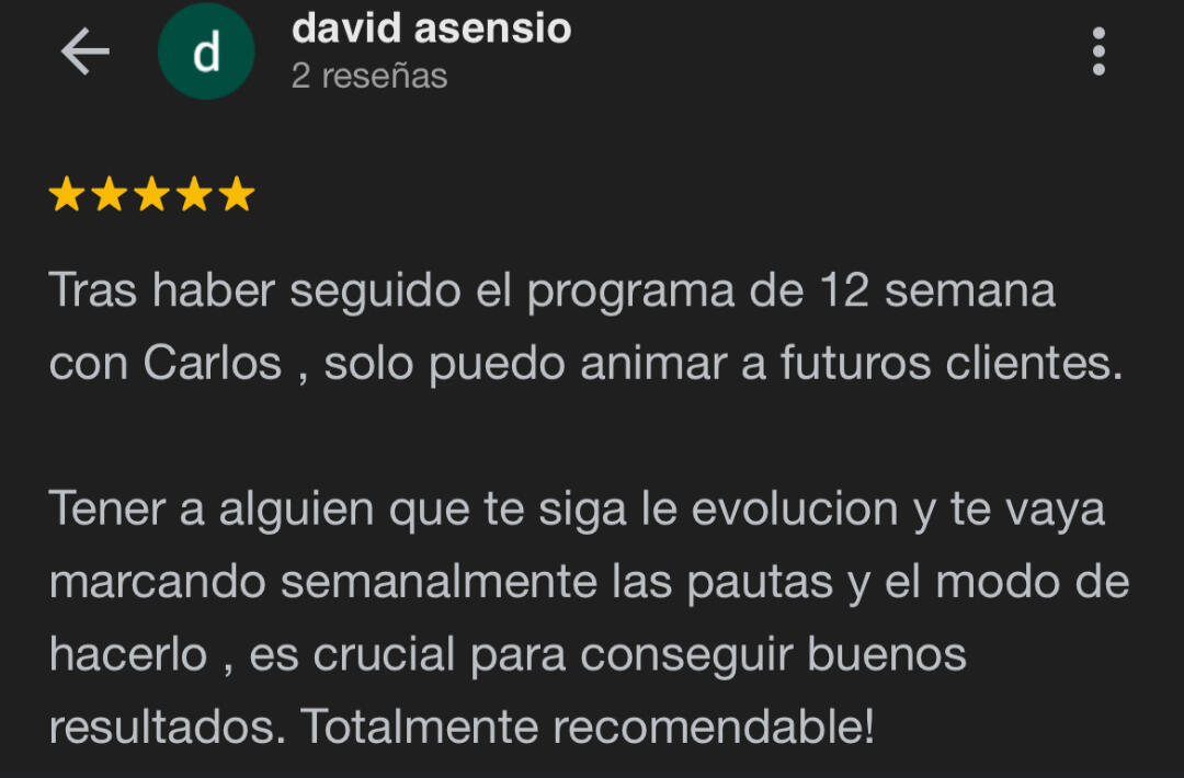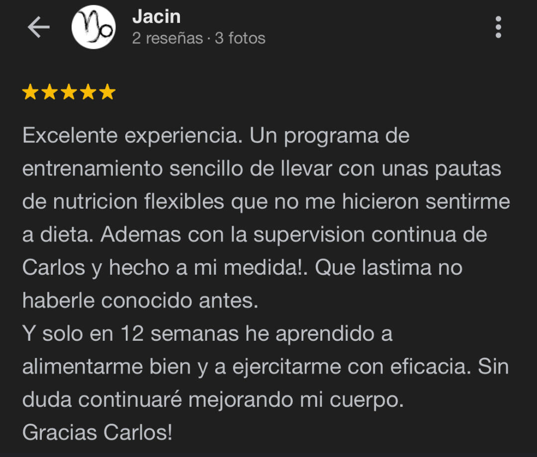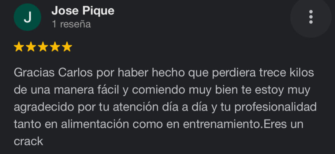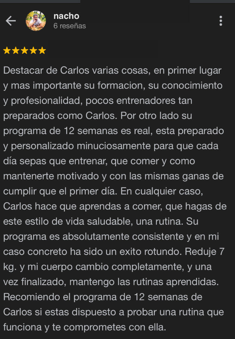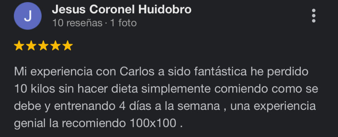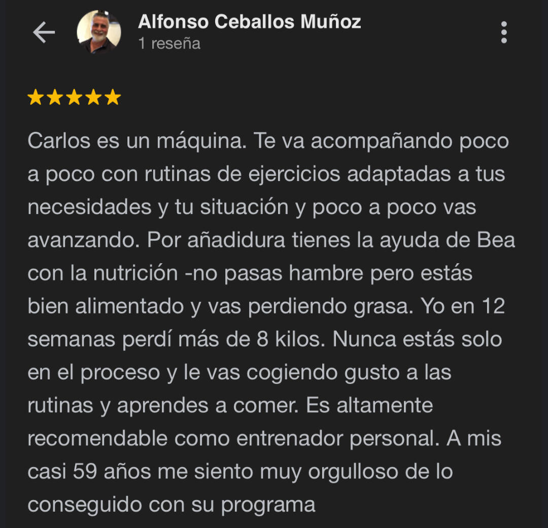 Después de años trabajando en centros presenciales de Entrenamiento y Nutrición, Carlos decidió dar un giro y empezar su proyecto: transformar la vida de hombres de más de 40 años que quieren recuperar energía, perder grasa y volver a sentirse en forma.Desde 2020 ha construido una marca personal que no solo inspira a miles de hombres cada día en redes sociales, sino que también le ha permitido acompañar a cientos de clientes en procesos de cambio físico y mental profundos.Con más de 100.000 seguidores, una comunidad en crecimiento y resultados contrastados —pérdidas de más de 15 kg en 3 meses, reducción de tallas, mejora de salud y confianza—, Carlos se ha consolidado como un referente en nutrición práctica, entrenamiento inteligente y hábitos sostenibles para hombres +40.Hoy dedica su tiempo a ayudar a hombres que ya lo han intentado todo sin éxito a encontrar un sistema claro, realista y adaptado a su edad, que les permita verse y sentirse como siempre quisieron, sin la necesidad de estar a dieta ni sufriendo durante el proceso.