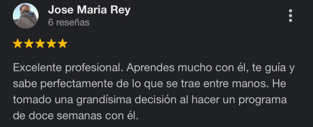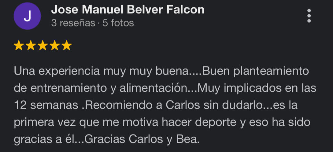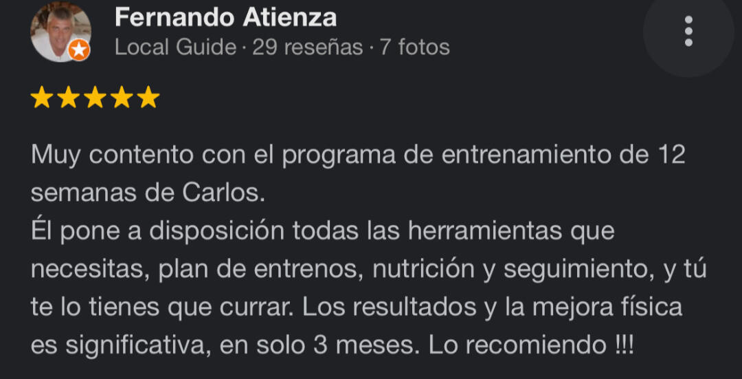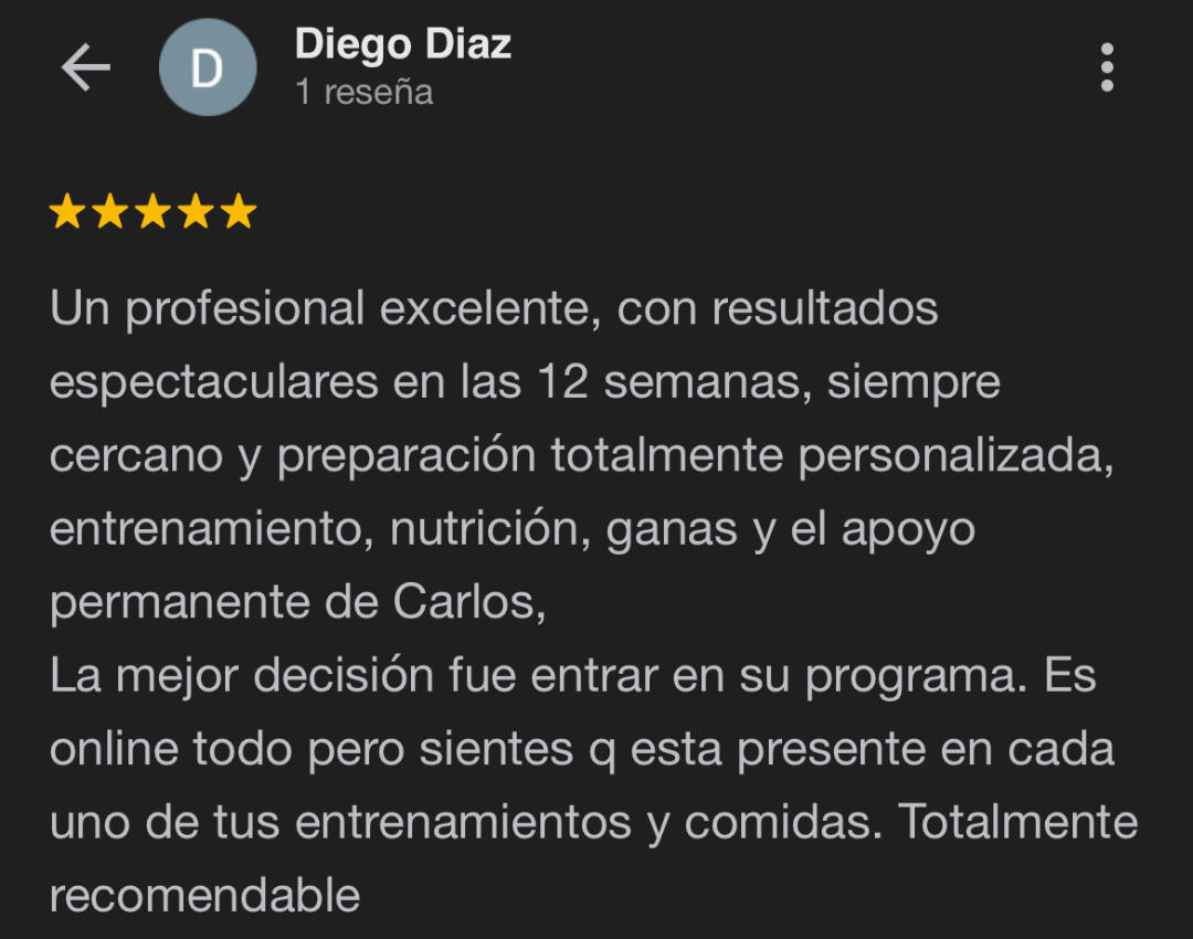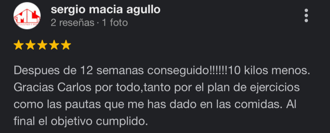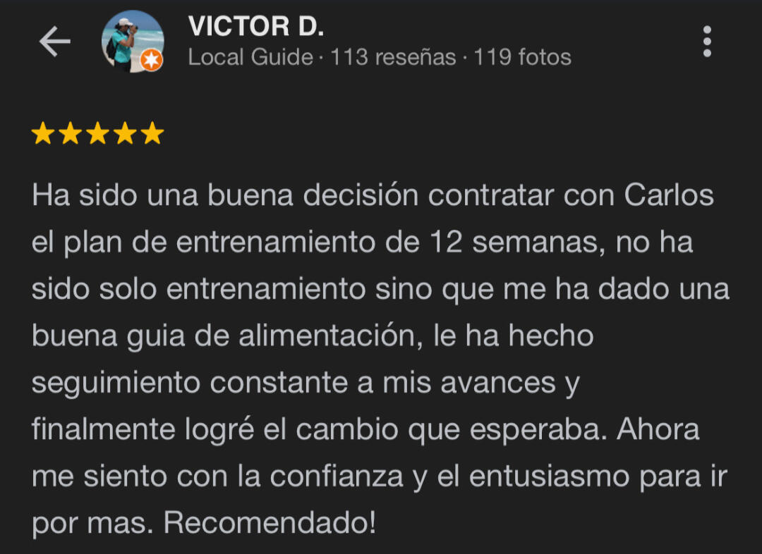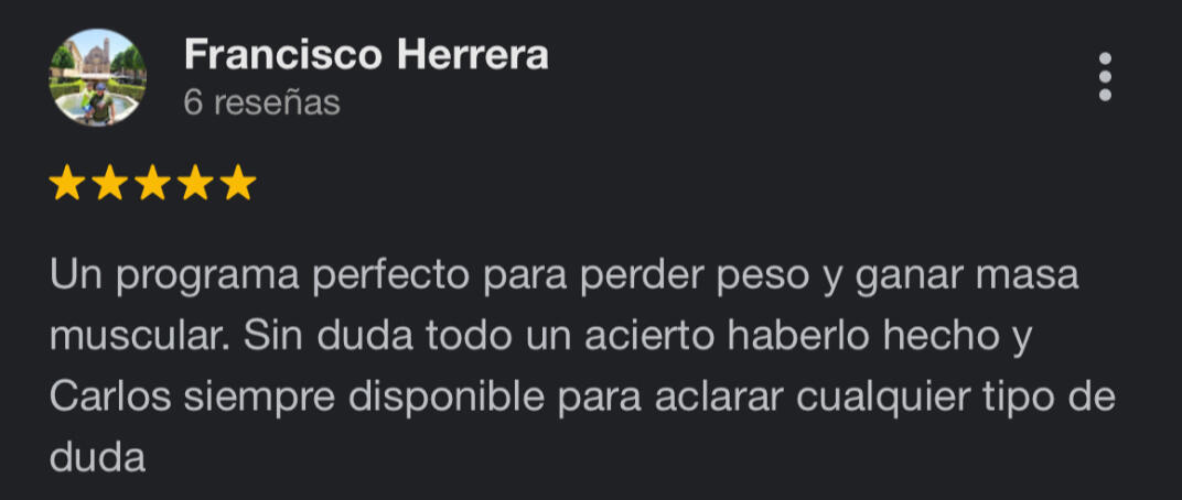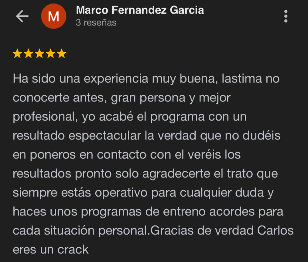 Después de años trabajando en centros presenciales de Entrenamiento y Nutrición, Carlos decidió dar un giro y empezar su proyecto: transformar la vida de hombres de más de 40 años que quieren recuperar energía, perder grasa y volver a sentirse en forma.Desde 2020 ha construido una marca personal que no solo inspira a miles de hombres cada día en redes sociales, sino que también le ha permitido acompañar a cientos de clientes en procesos de cambio físico y mental profundos.Con más de 100.000 seguidores, una comunidad en crecimiento y resultados contrastados —pérdidas de más de 15 kg en 3 meses, reducción de tallas, mejora de salud y confianza—, Carlos se ha consolidado como un referente en nutrición práctica, entrenamiento inteligente y hábitos sostenibles para hombres +40.Hoy dedica su tiempo a ayudar a hombres que ya lo han intentado todo sin éxito a encontrar un sistema claro, realista y adaptado a su edad, que les permita verse y sentirse como siempre quisieron, sin la necesidad de estar a dieta ni sufriendo durante el proceso.