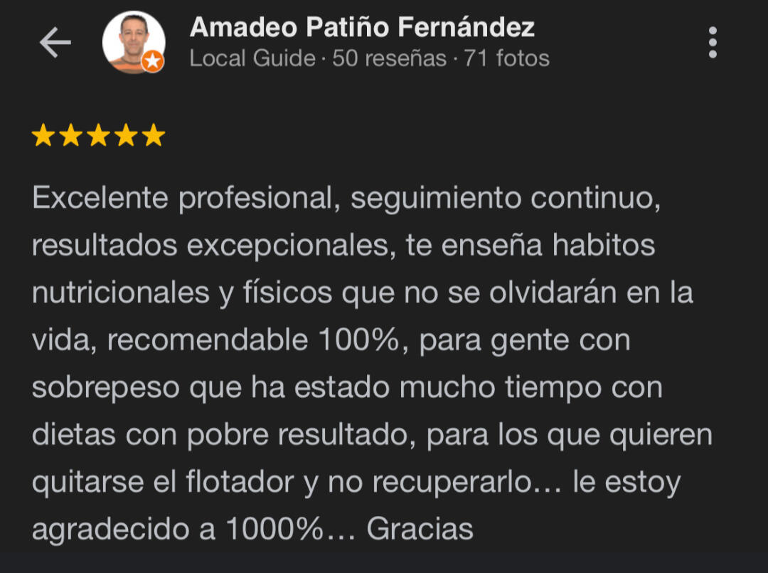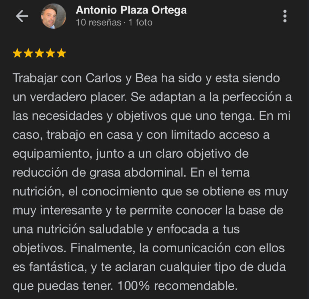 Entrenaba a diario y pensaba que comía sano, pero llevaba años estancado con la grasa abdominal y sin progresar en fuerza.En menos de 3 meses perdió 9 kg, redujo notablemente su cintura y ganó fuerza con entrenamientos más eficientes.Hoy se siente más fuerte, más definido y, sobre todo, con un plan que sabe mantener en el tiempo.Lo resume así: “Ha sido una de las mejores inversiones de mi vida. No me he sentido a dieta ni un solo día.”
