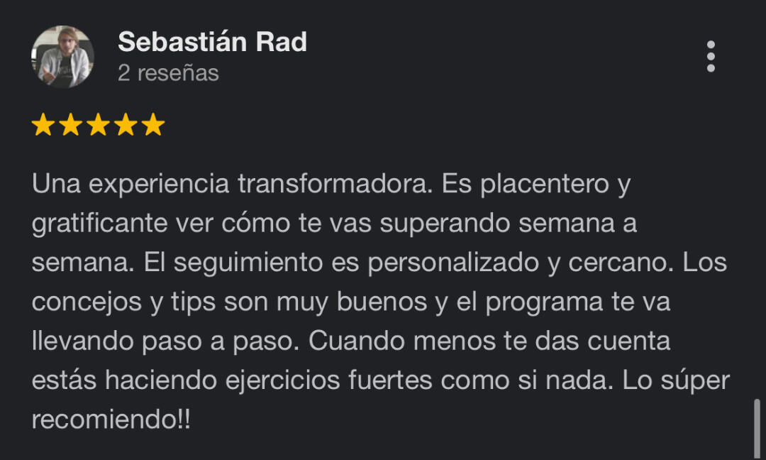 5. Accountability semanal y Seguimiento diarioDesde el día 1 del programa, tendrás acceso a un grupo exclusivo de WhatsApp, donde estarás en contacto directo conmigo y un miembro de mi equipo entrenador y nutricionista. Esto te permitirá resolver cualquier duda al instante, recibir apoyo continuo y ajustar tus rutinas o planes en tiempo real. Tendrás un equipo de expertos siempre a tu disposición para asegurarte de que nunca te sientas solo en este proceso.Además, tendrás acceso a una app desde la que se realizará el seguimiento y que te permitirá a ti y a nosotros ajustar, medir y ver el progreso que estás consiguiendo semana tras semana.
